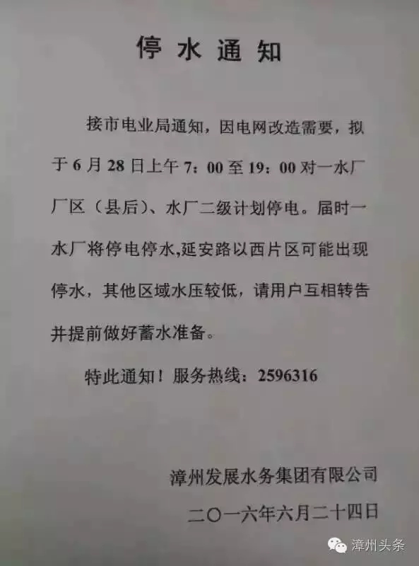 根據(jù)漳州市電業(yè)局通知,因電網(wǎng)改造需要,6月28日上午7:00至19:00,將對漳州一水廠廠區(qū)(縣后)、水廠二級計劃停電。屆時,一水廠將停電停水,延安路以西片區(qū)可能出現(xiàn)停水,其他區(qū)域水壓較低,請用戶互相轉(zhuǎn)告并提前做好蓄水準備。